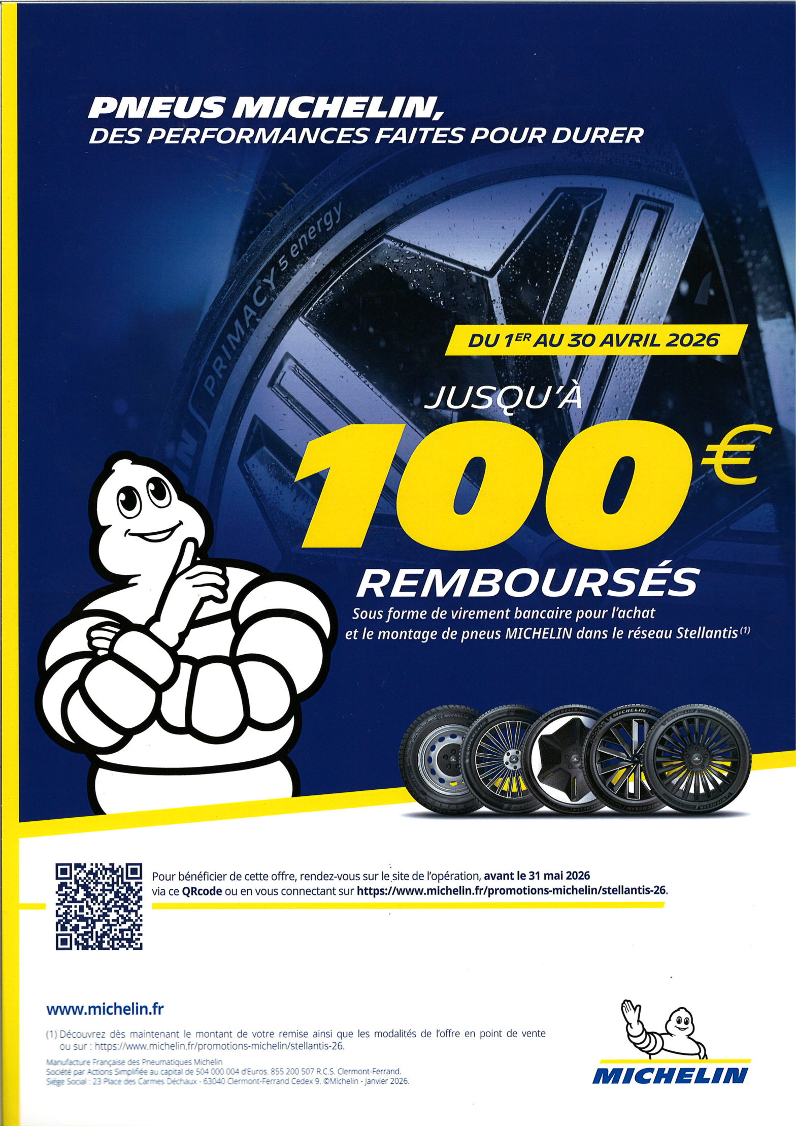 DU 01 AVRIL AU 30 AVRIL 2026 RECEVEZ JUSQU’À 100€* En remboursement par virement bancaire pour l’achat et la pose de 2 ou 4 pneus MICHELIN été, hiver ou CrossClimate. *Voir condition en magasin